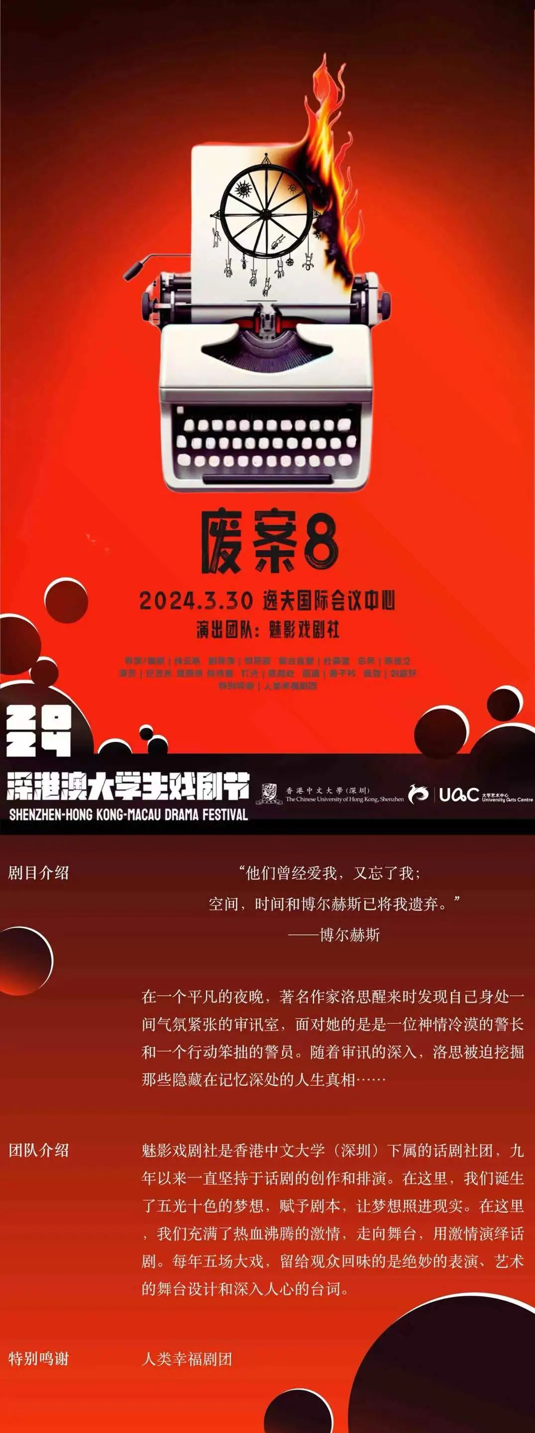 March 27th is “World Theatre Day”, established by the International Theatre Institute (ITI) to raise global awareness and appreciation for the art of theatre.?Today, the performances of 2024 Shenzhen-Hong Kong-Macau University Student Drama Festival are officially open for registration!