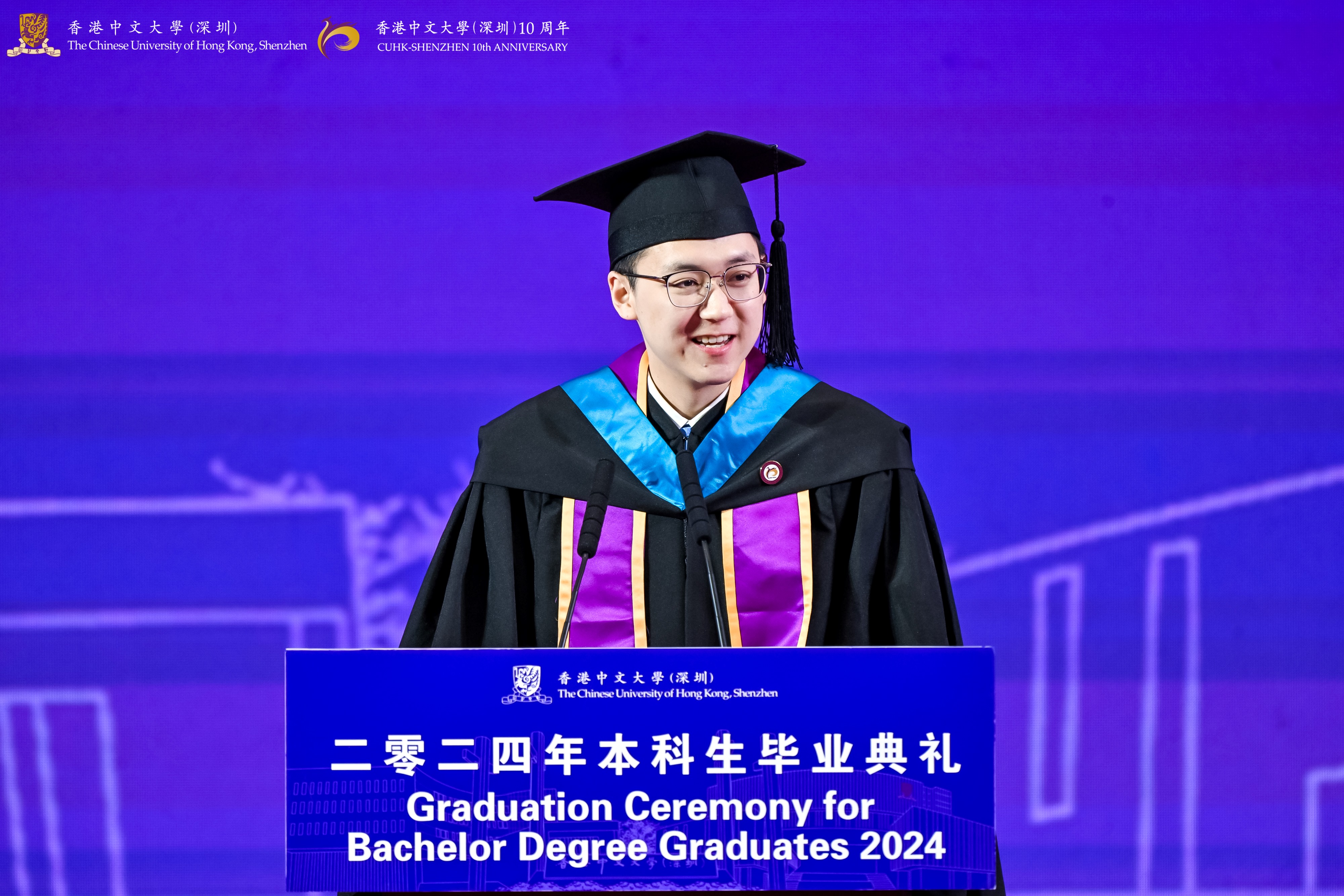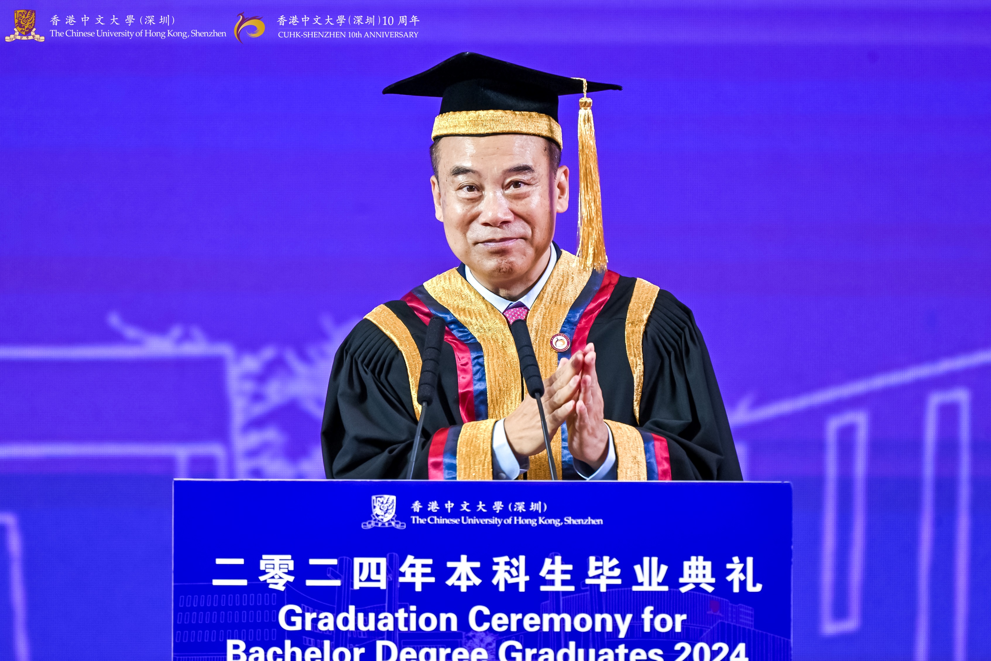 2024 marks the 10th anniversary of The Chinese University of Hong Kong, Shenzhen. Before the start of the graduation ceremony, the students uniformly placed a 10th anniversary commemorative badge on chest, wishing the University another decade of brilliance and success.