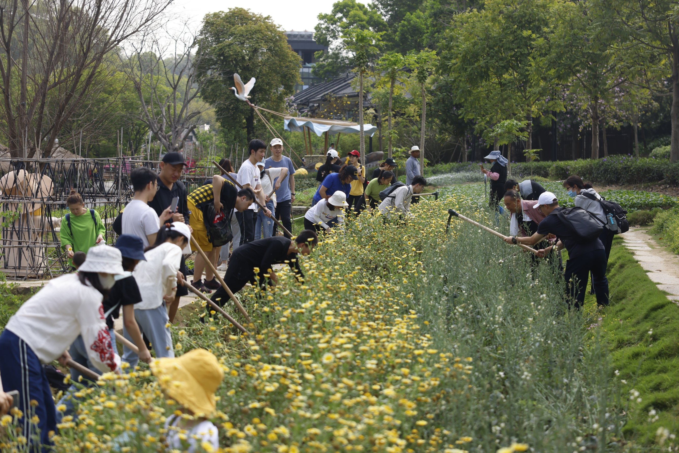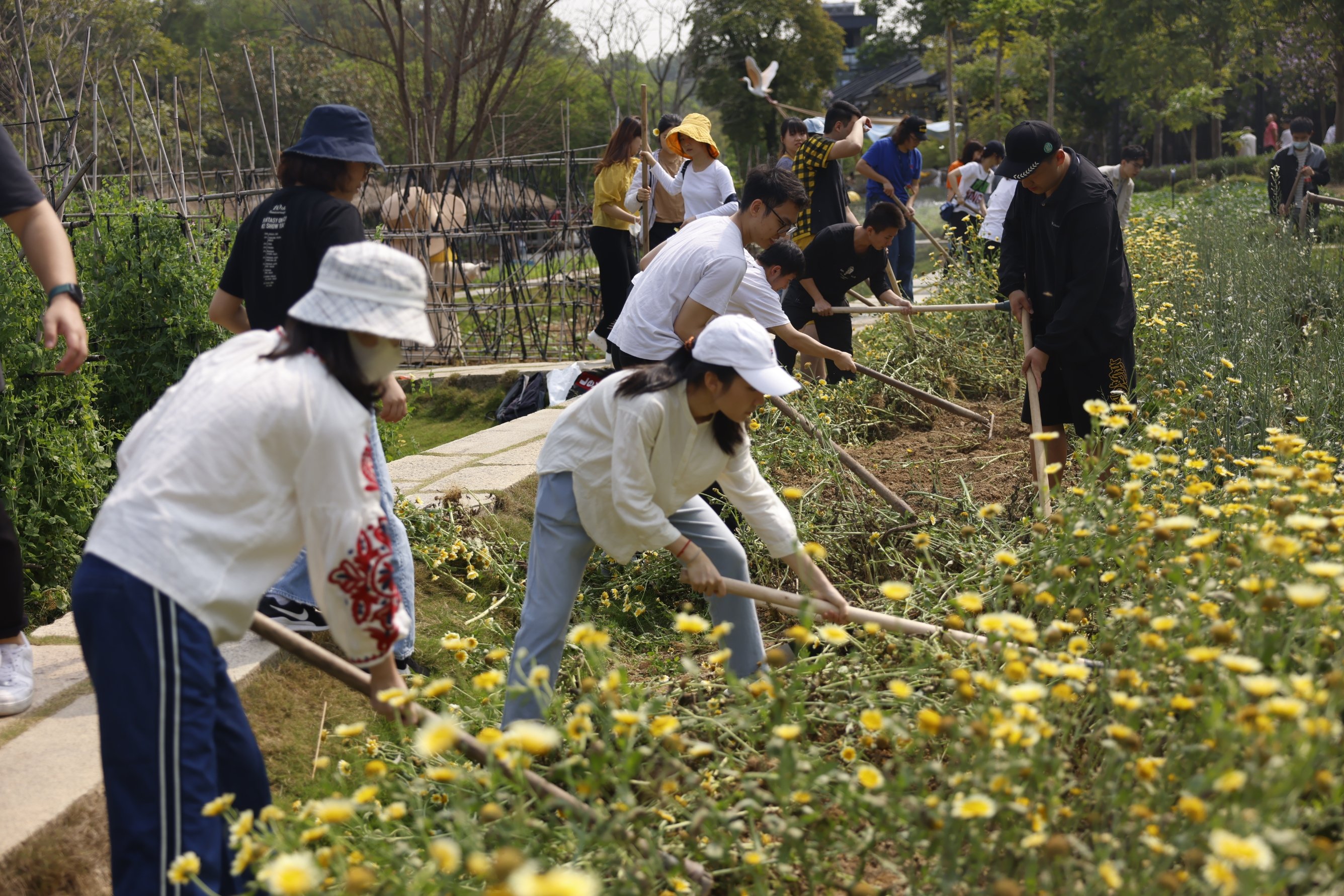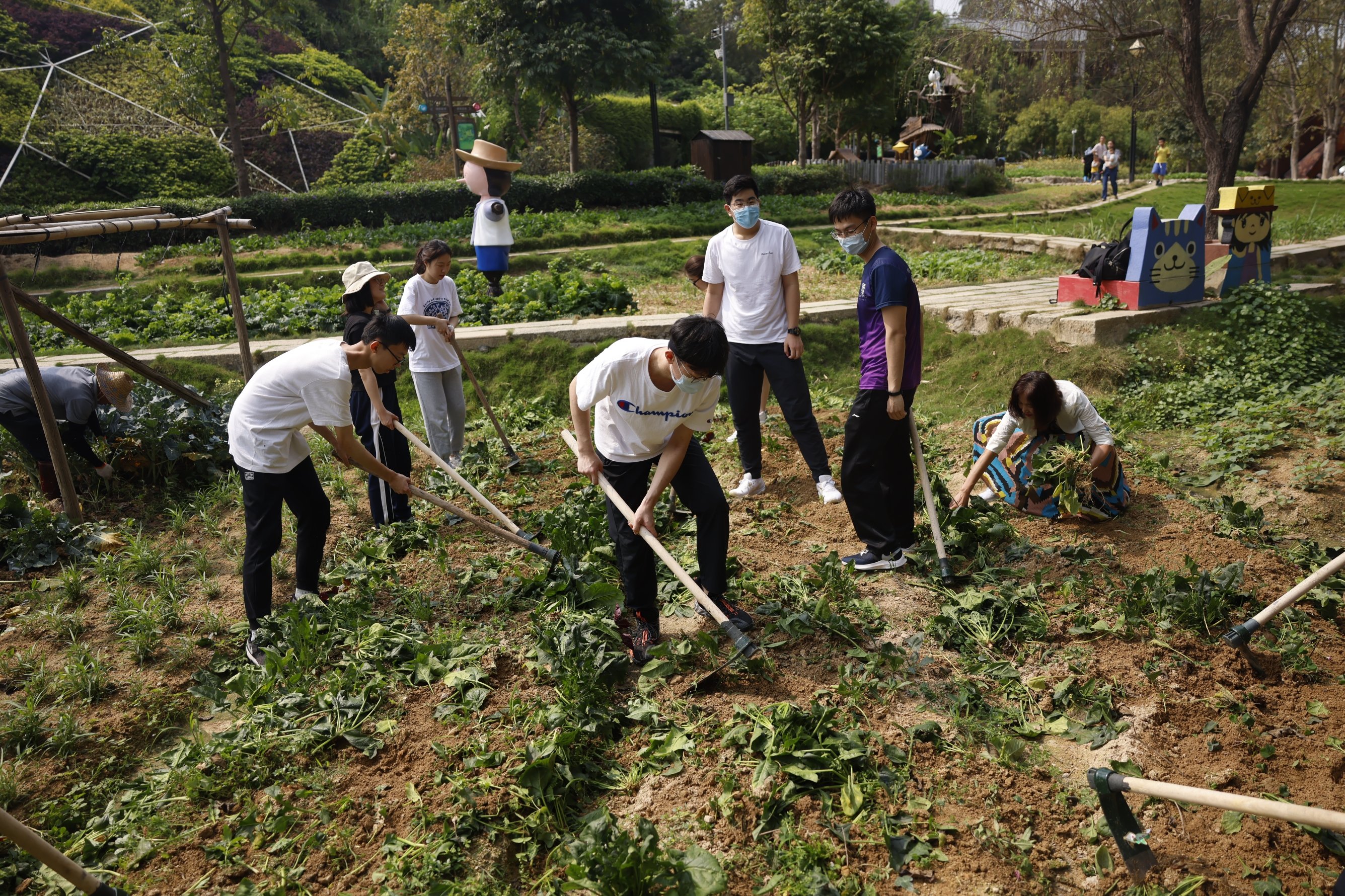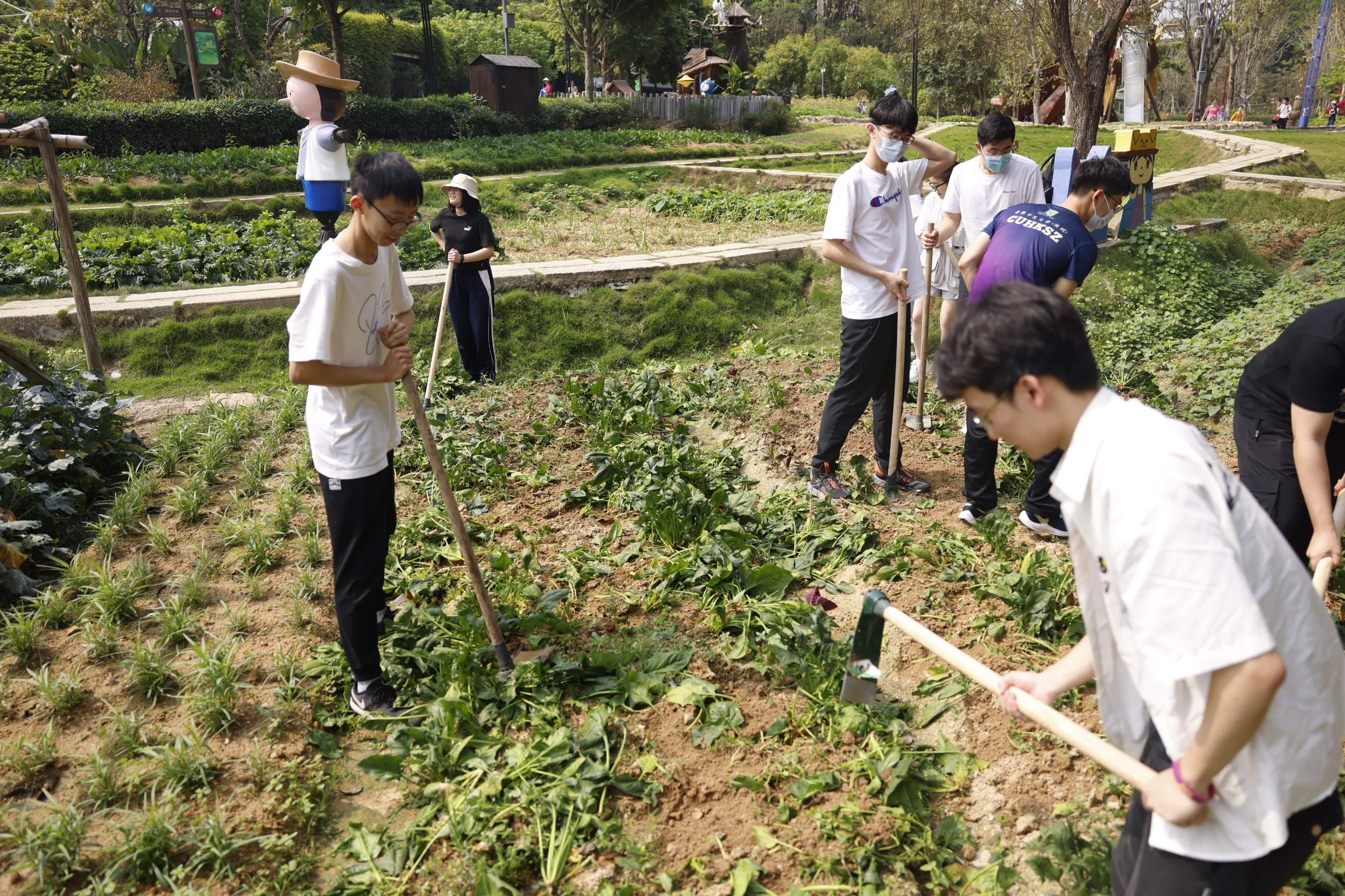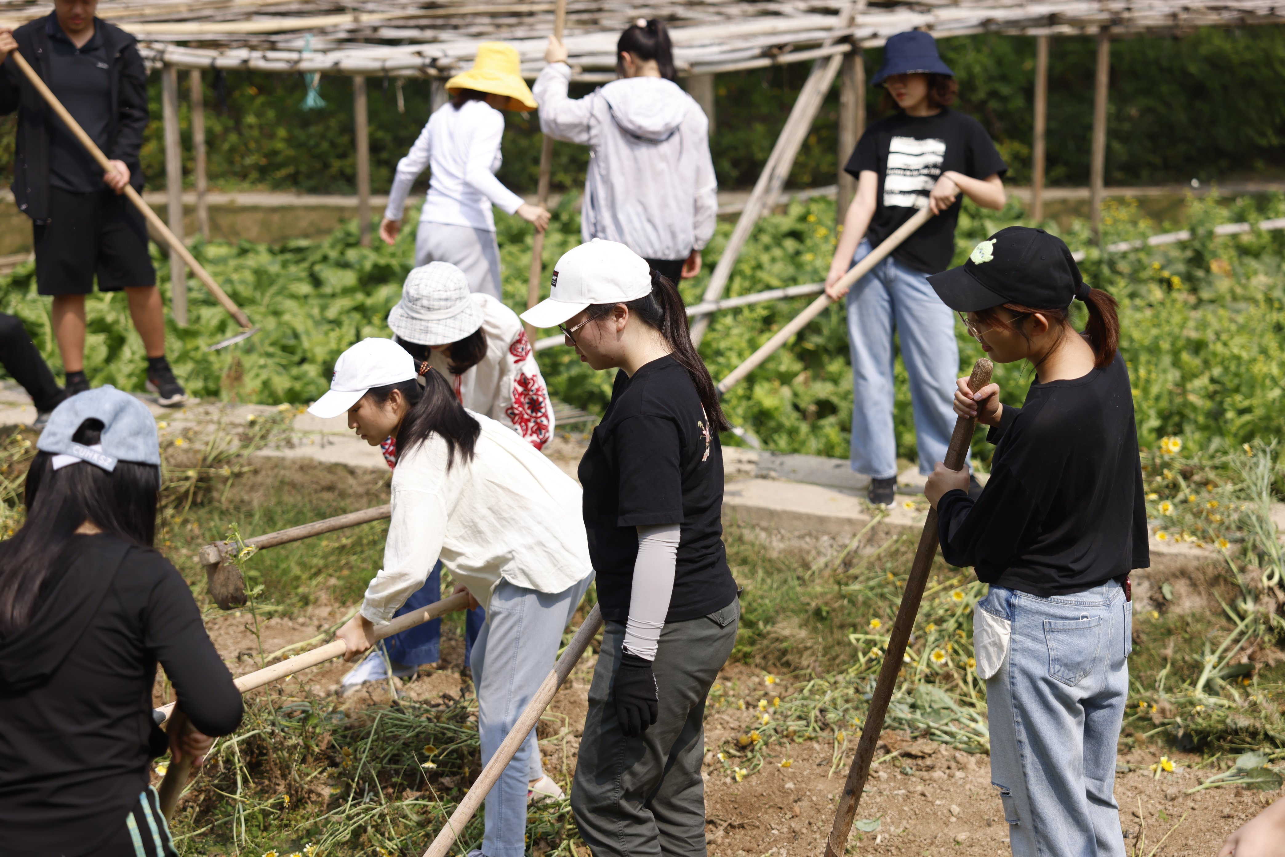 Briefly escaping from the busy schedule, the students picked up hoes and learned how to plow, sort out weeds, loosen and turn the soil with President Xu.