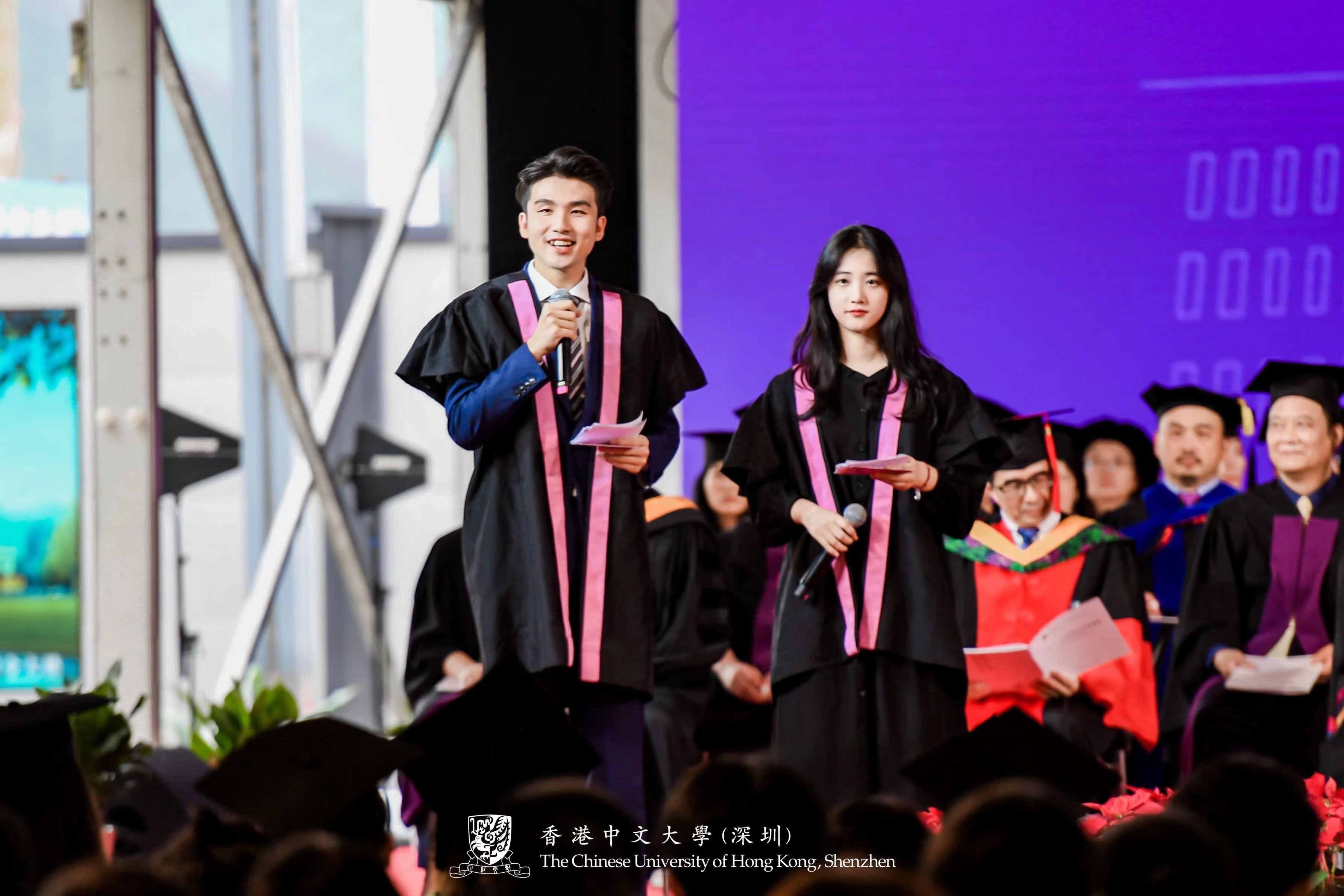 During his address, Professor Yangsheng Xu, President of The Chinese University of Hong Kong, Shenzhen, reminisced with the graduates about the jacaranda trees planted along Central Boulevard four years ago. He said: "Later, in September of the same year, you arrived on the campus and started your four-year journey with us. From then on, you have continued to grow yourself as a member of our University. Like the jacaranda trees, you have grown in maturity, with the foliage more and more luxuriant day by day. Over the past four years, you have experienced not only days of sunshine but also hours of storm. Now your blossom time comes. Your efforts have come into flower like the jacaranda blooms in this season. You have made a significant accomplishment in the bloom of your youth. "