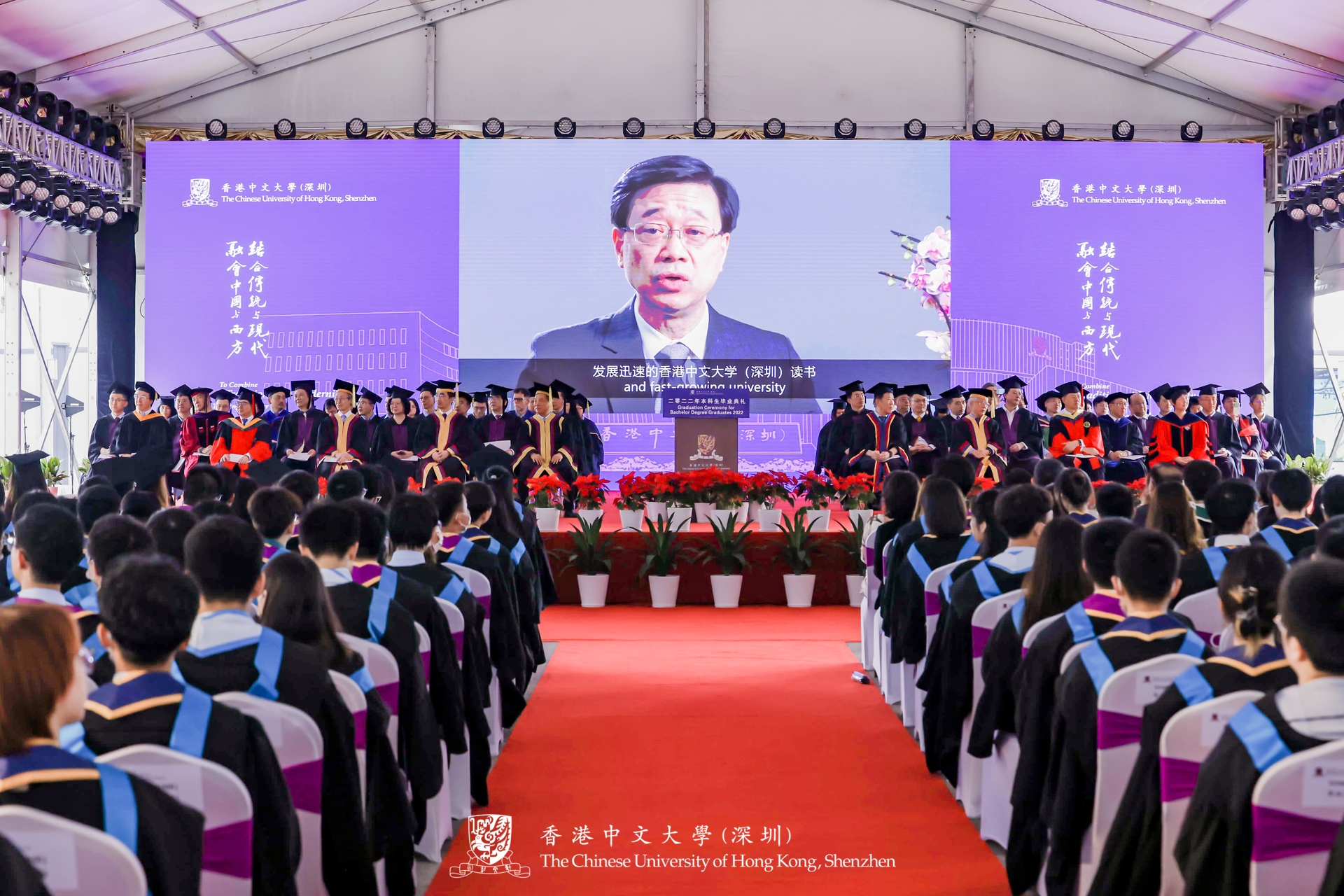 The CUHK-Shenzhen Graduation Ceremony for Bachelor Degree Graduates 2022 was hosted on the University Central Mall on the morning of May 21. President Yangsheng Xu, university administrators and faculty were all on hand to witness the significant milestone of the graduates. Mr. John Lee, the Chief Executive-elect of the Hong Kong Special Administrative Region, and Professor Guoping Zhou, a renowned philosopher, delivered statements and expressed their best wishes for the occasion. Due to COVID-19 constraints, a hybrid format was adopted to accommodate the online participation of international students, parents and friends, and guests from all walks of life.