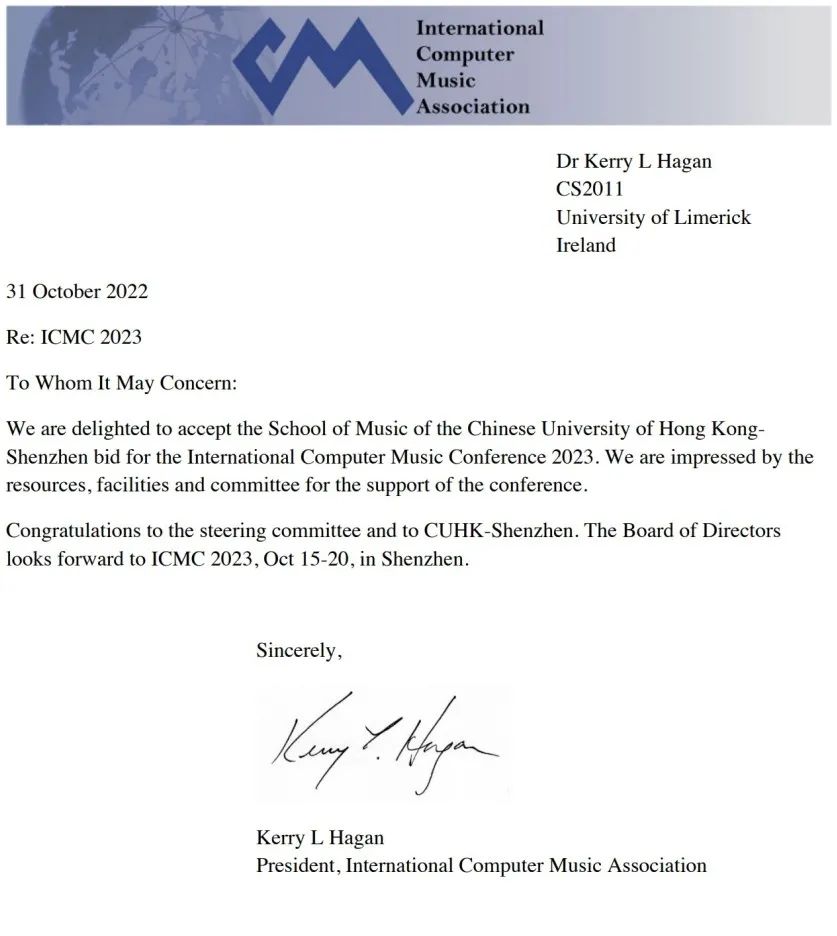 On October 26, 2022, the International Computer Music Association (ICMA) Board officially announced that the School of Music, The Chinese University of Hong Kong, Shenzhen has won the bidding for hosting the 2023 International Computer Music Conference (ICMC).