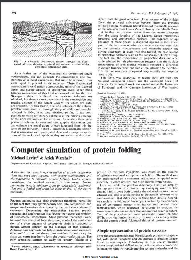 Prof. Warshel’s paper published on Nature in 1975. He was awared the Nobel Prize for his research in multiscale models for complex chemical systems(Levitt, M., & Warshel, A. (1975). Computer simulation of protein folding. Nature, 253(5494), 694-698.)
