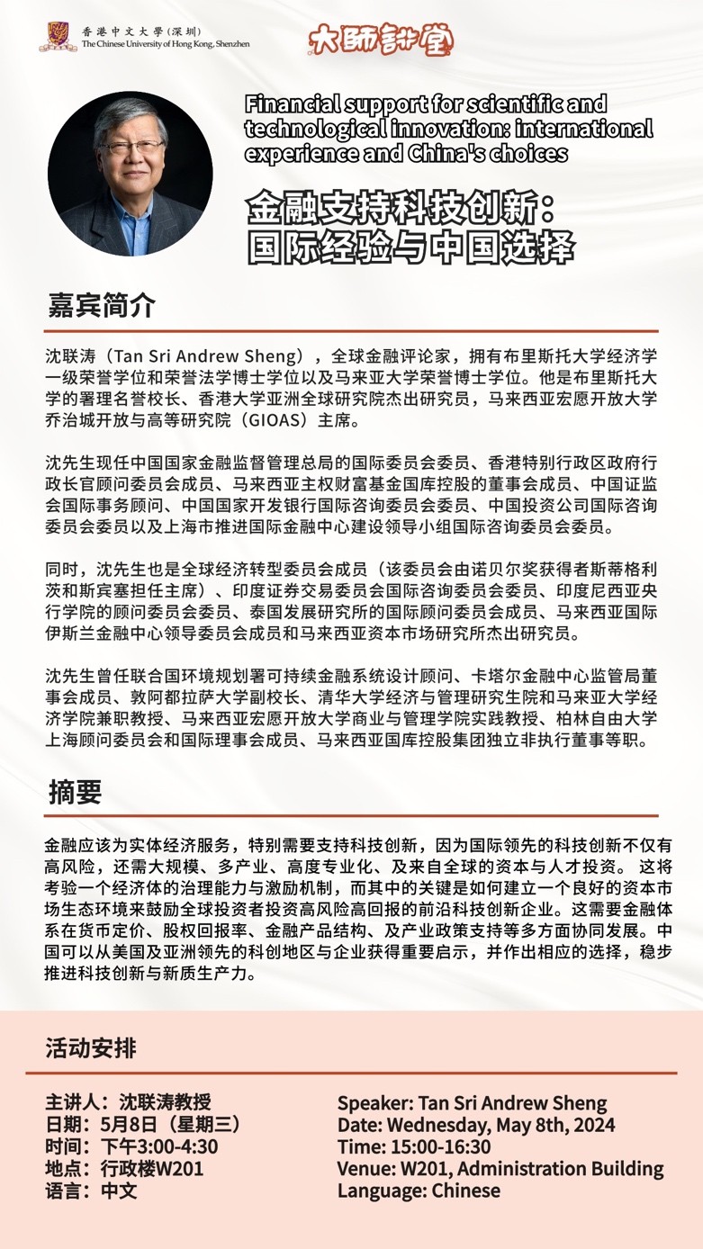 Finance is a critical pillar for the real economy, particularly in the realm of technological innovation which is characterized by high risks and demands significant investments in capital and specialized talent across various global industries. This lecture explores how robust governance and effective strategic incentives are vital for cultivating a thriving capital market ecosystem that can attract global investments in innovative, high-risk, high-return technology enterprises. It highlights the necessity for coordinated development within the financial system, encompassing monetary pricing, equity returns, financial product structuring, and supportive industrial policies. By drawing on successful practices from the United States and Asia's leading tech hubs, the presentation will propose strategic options for China to boost its technological innovation and the burgeoning “new quality productive forces”.