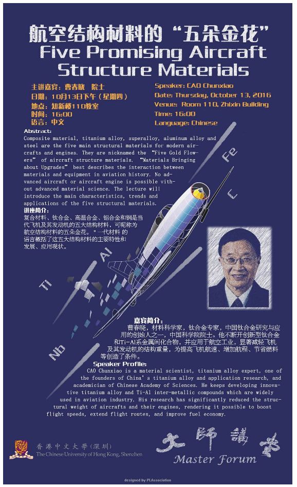 Composite material, titanium alloy, superalloy, aluminum alloy and steel are the five main structural materials for modern aircrafts and engines. They are nicknamed the “Five Gold Flowers” of aircraft structure materials. “Materials Bringing about Upgrades” best describes the interaction between materials and equipment in aviation history. No advanced aircraft or aircraft engine is possible without advanced material science. The lecture will introduce the main characteristics, trends and applications of the five structural materials.?