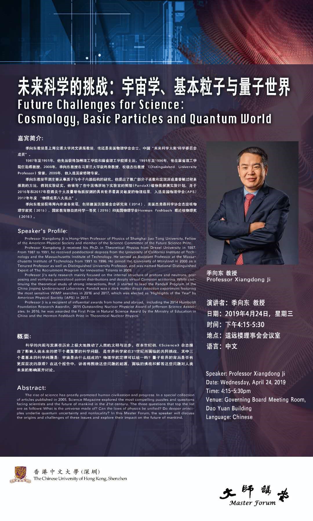 ? ? ? ? You are cordially invited to Master Forum delivered by?Prof. Xiangdong Ji?from 4:15-5:30pm?on April 24, 2019.