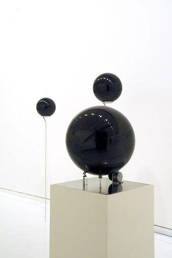 An installation consisting of cassette tape wound around a spherical object and a device to play its sound. There is no start nor end of the tape on the sphere and it continues to move randomly, emitting noises.