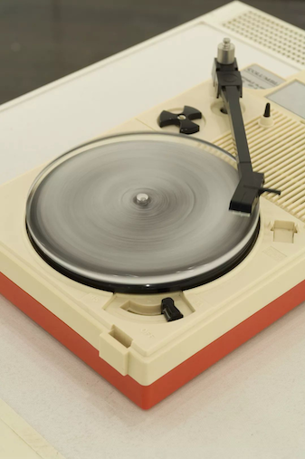 A record made of ice, by freezing water in a silicon mold. The ice record melts and the music evaporates as time goes by.