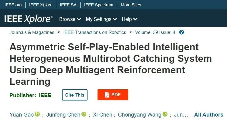 2023年8月,IEEE T-RO在線發表題為“Asymmetric Self-Play-Enabled Intelligent Heterogeneous Multirobot Catching System Using Deep Multiagent Reinforcement Learning”的論文。該論文提出了一種創新的多智能體強化學習框架,并實現其在機器人圍捕任務中的應用。深圳市人工智能與機器人研究院高源博士為論文第一作者,林天麟教授為論文獨立通訊作者。