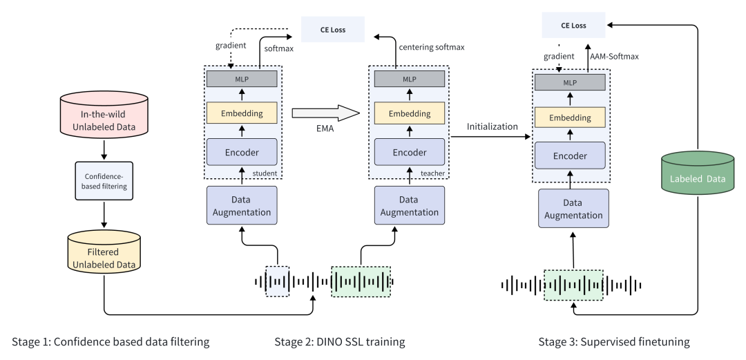 當(dāng)前的說話者識(shí)別系統(tǒng)主要采用受監(jiān)督方法,但受限于標(biāo)記數(shù)據(jù)集的規(guī)模。為了提升系統(tǒng)性能,研究人員利用大型預(yù)訓(xùn)練模型(例如WavLM),將學(xué)到的高級(jí)特征遷移到下游的說話者識(shí)別任務(wù)。然而,這種方法在預(yù)訓(xùn)練模型保留在推理階段時(shí)引入了額外的參數(shù)。另一種思路則是直接采用自監(jiān)督方法(如DINO)進(jìn)行說話者嵌入學(xué)習(xí),但是目前還未有工作驗(yàn)證過在大規(guī)模的真實(shí)無標(biāo)簽數(shù)據(jù)上的相關(guān)效果。本研究展示了在大規(guī)模WenetSpeech數(shù)據(jù)集上進(jìn)行的DINO訓(xùn)練的有效性,并證實(shí)了其在增強(qiáng)對(duì)CNCeleb數(shù)據(jù)集的受監(jiān)督系統(tǒng)性能方面的可遷移性。此外,我們引入了一種基于置信度的數(shù)據(jù)過濾算法,用于從預(yù)訓(xùn)練數(shù)據(jù)集中排除不可靠的數(shù)據(jù),從而在使用更少訓(xùn)練數(shù)據(jù)的情況下實(shí)現(xiàn)更優(yōu)越的性能表現(xiàn)。相關(guān)的預(yù)訓(xùn)練模型、置信度文件、預(yù)訓(xùn)練和微調(diào)腳本將提供在 Wespeaker 工具包中。