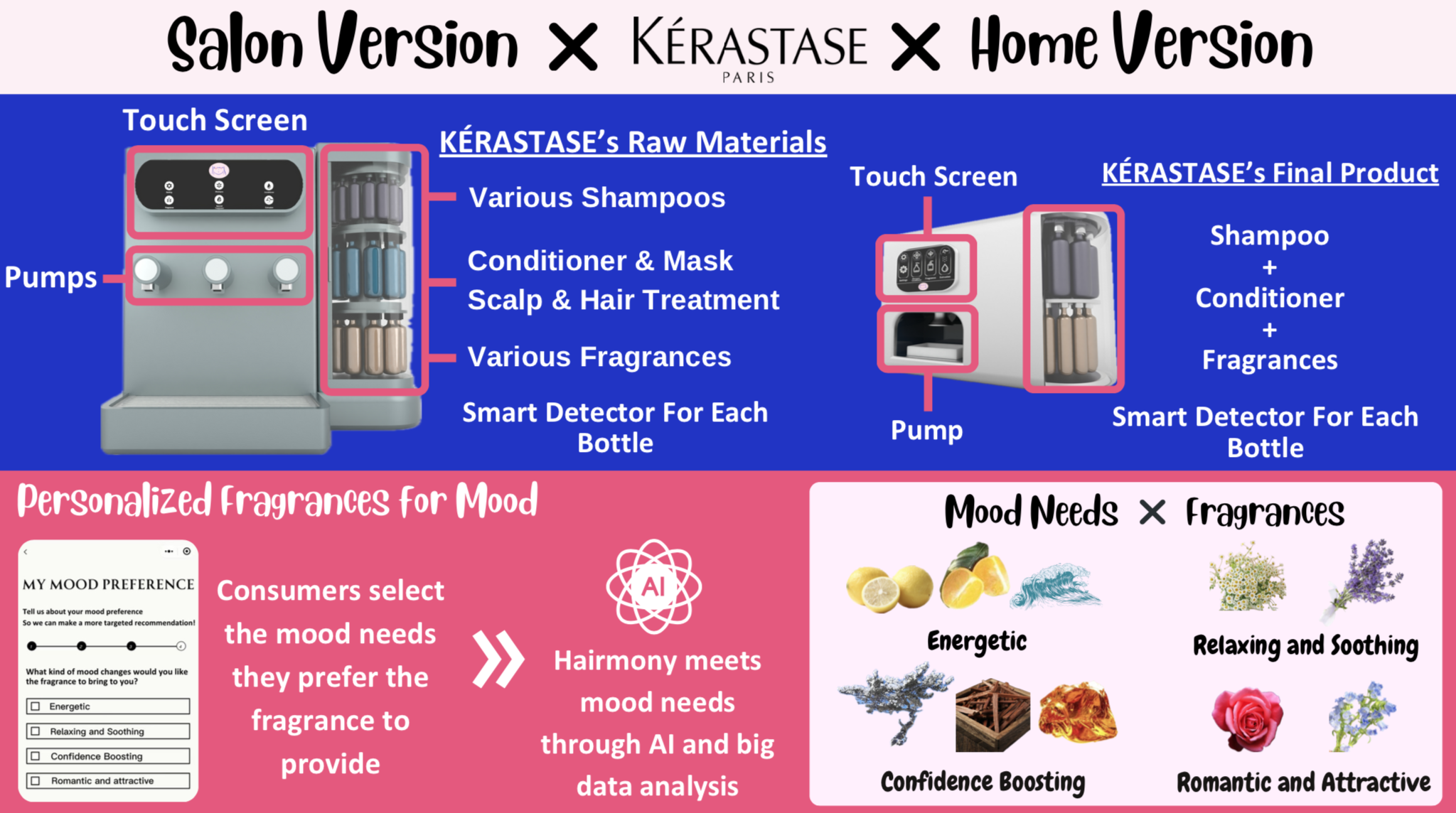 消費者因為各種各樣的頭發問題而感到困擾,目前,市場上沒有一款完美解決所有消費者需求的洗護發產品。The Hair Master戰隊針對此問題,打造了一款個性化洗護發機器——Hairmony,旨在為消費者提供高度個性化的頭發護理解決方案。Hairmony設有兩個版本:面向美發沙龍的專業版本,和面向家庭用戶的簡易版本。專業版本具備高容量和多種特殊護理功能,而家用版本則操作簡單,方便日常使用。
