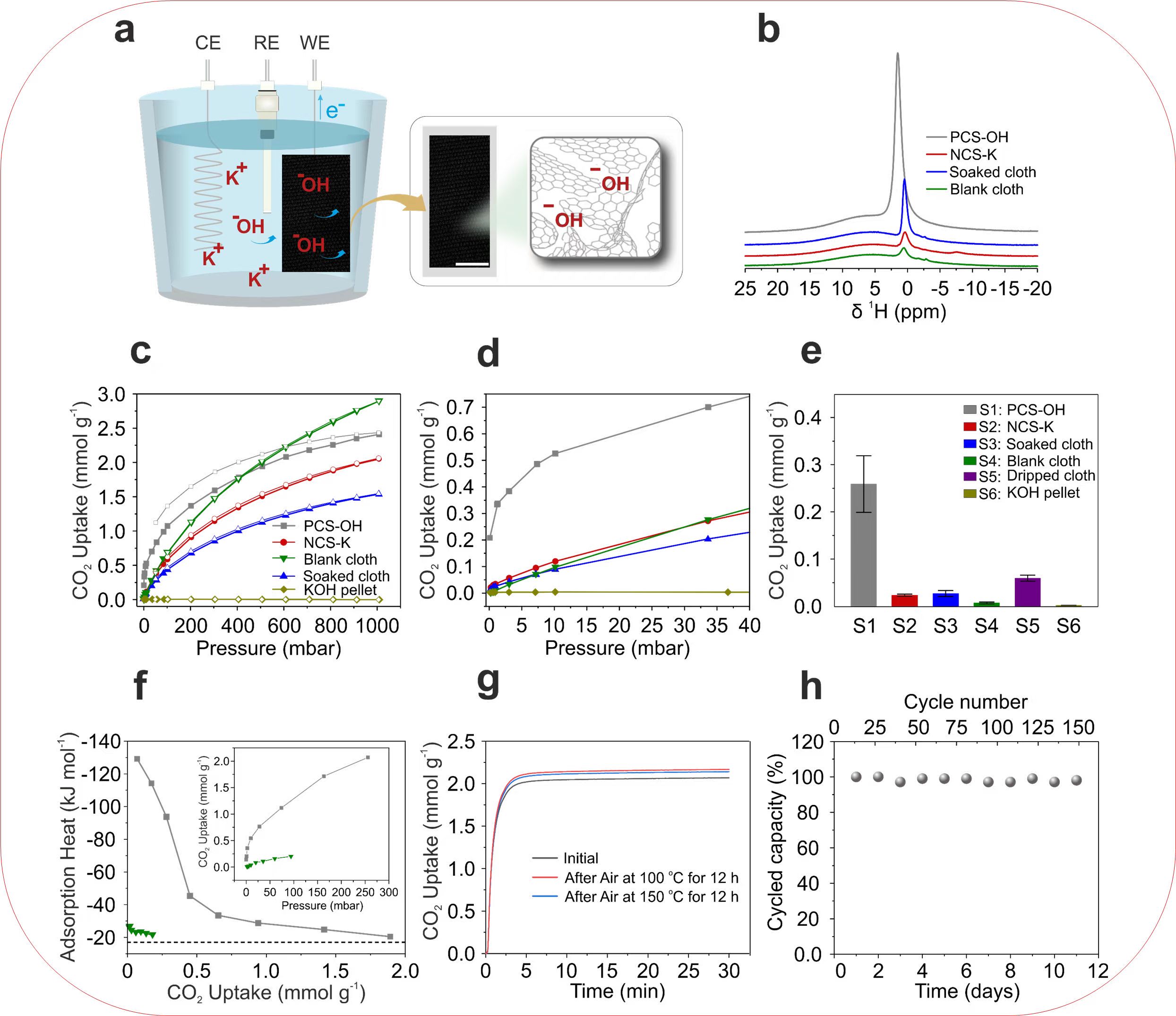 吸附熱是衡量吸附劑吸附功能強弱的重要指標(biāo)之一,吸附熱越大,吸附越強。與其它材料相比,帶電吸附劑(PCS-OH)的吸附熱顯著增加,高達137 kJ mol?1,對二氧化碳表現(xiàn)出極強的親和力,這為空氣中直接捕獲超低濃度二氧化碳提供了必要條件。同時,帶電吸附劑也表現(xiàn)出優(yōu)異的穩(wěn)定性,在連續(xù)11天測試中吸附性能保持100%,14個月后性能僅僅下降8%。