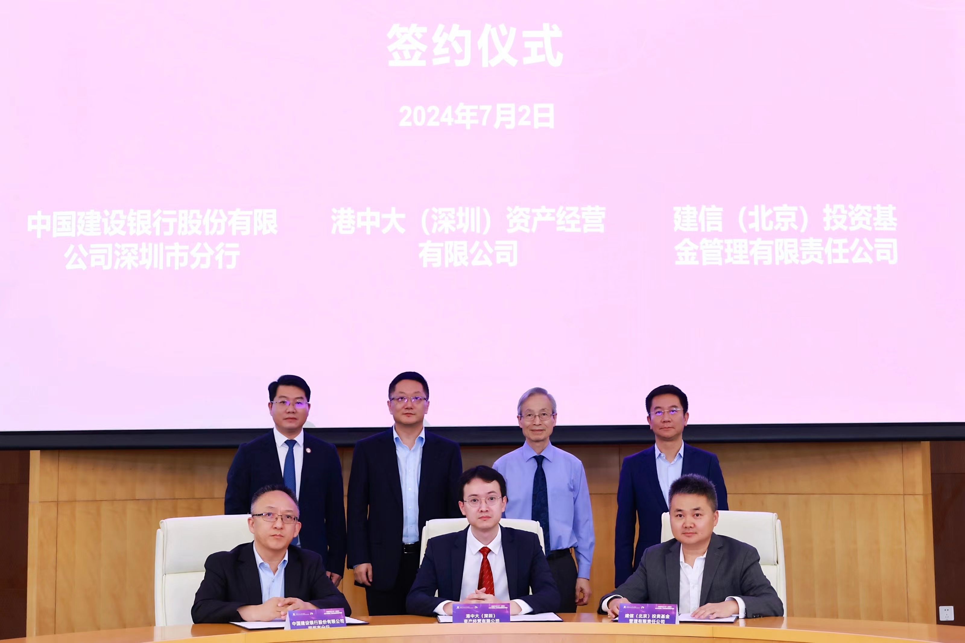 簽約儀式現場,校方代表港中大(深圳)資產經營有限公司副總經理沈灝與中國建設銀行股份有限公司深圳市分行福田支行黨委書記、行長王貴斌,建信(北京)投資基金管理有限責任公司執行總監鄧鋒簽署了三方戰略合作框架協議,并分別與深圳市投控東海投資有限公司基金發行部負責人穆春衛,深圳市招商國協壹號股權投資基金管理有限公司副總裁楊田田簽署了雙方協議。