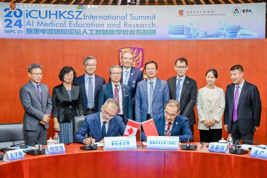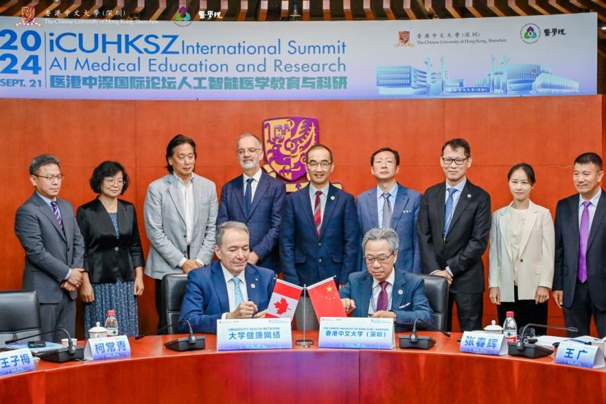 在與會嘉賓的共同見證下,香港中文大學(深圳)副校長羅智泉教授和多倫多大學副校長兼教務長Trevor YOUNG教授代表雙方簽署合作備忘錄與學生交流協議;香港中文大學(深圳)醫學院創院院長鄭仲煊教授和多倫多大學健康網絡總裁兼首席執行官Kevin SMITH教授代表雙方簽署合作備忘錄等。據介紹,香港中文大學(深圳)及醫學院將與合作伙伴在教育、科研、人才培養等方面開展全方位合作,共同培養新一代具備人工智能(AI)能力的醫學人才,推動醫學教育和醫療保健領域發展。