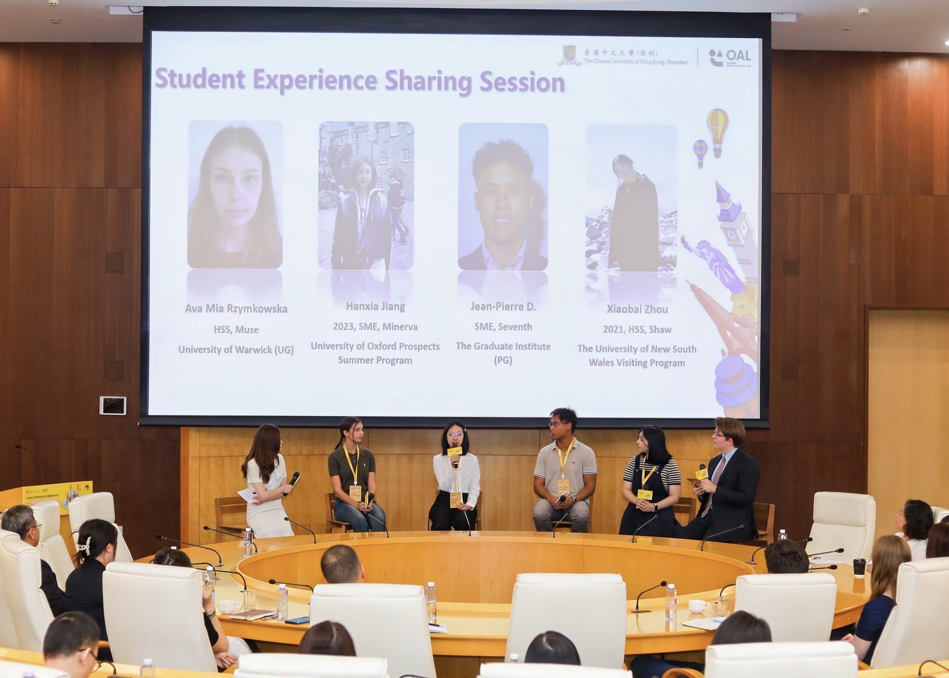 在學生分享環(huán)節(jié),來自港中大(深圳)人文社科學院、逸夫書院的周小白和經管學院、厚含書院的姜函夏分別分享了自己參加澳大利亞新南威爾士大學交流項目及英國牛津大學暑期項目的經歷;來自英國華威大學的Mia Rzymkowska 和瑞士日內瓦國際關系及發(fā)展高等學院的Jean-Pierre Desarzens 則分享了自己在港中大(深圳)的交換學習歷程。