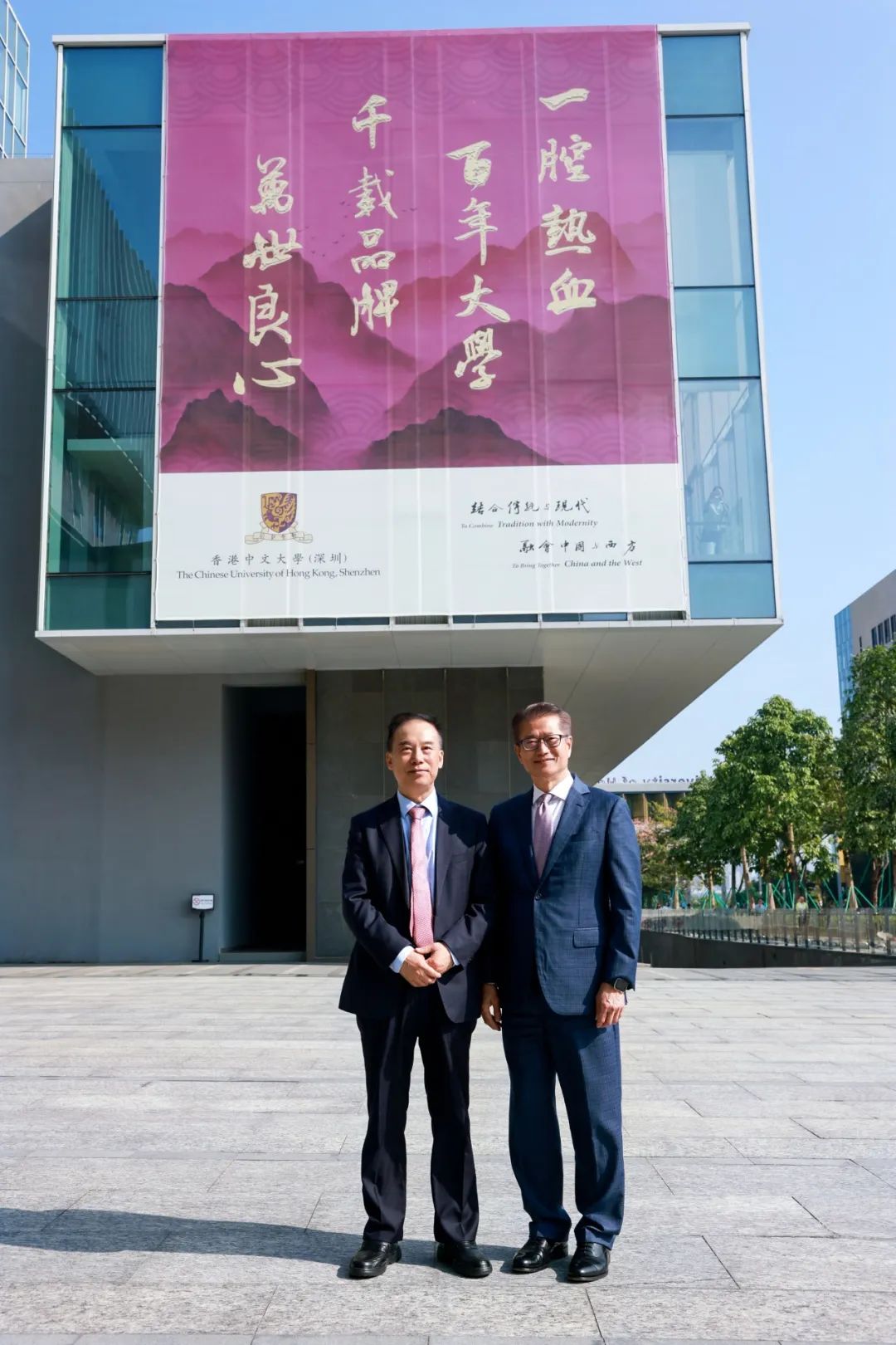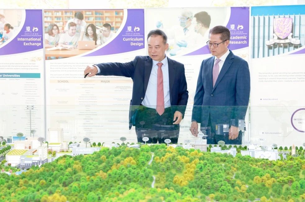 陳茂波司長在徐揚生校長的陪同下考察校園,聽取大學發展十年來的學科建設、人才培養、國際化一流師資的吸納、校園建設情況的介紹,親身感受大學秉持“一個品牌,兩個校園”的發展理念。陳茂波司長表示,欣悉大學在十年間取得的成績,期望港中大和港中大(深圳)同心協力,攜手并進,為兩座城市及整個大灣區培育高端人才,為國家的高質量發展作出新的更大貢獻。