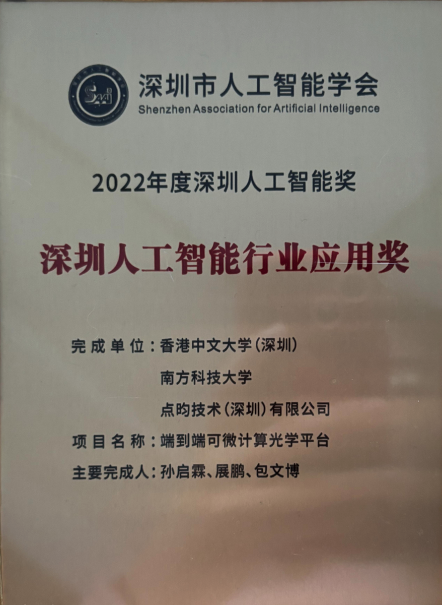 由孫啟霖教授領(lǐng)航的點昀技術(shù)是國際領(lǐng)先的端到端智能視覺系統(tǒng)方案商,專注于打造端到端感知與交互新入口,致力于推動下一代計算攝像革命。在2022年第二屆“深圳人工智能獎”的評選中,孫啟霖教授團隊研發(fā)的“端到端可微計算光學(xué)平臺”獲得“深圳人工智能行業(yè)應(yīng)用獎”,成為了入選的14項成果中最年輕的初創(chuàng)企業(yè)。