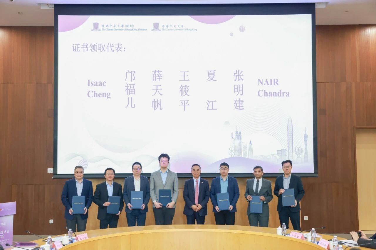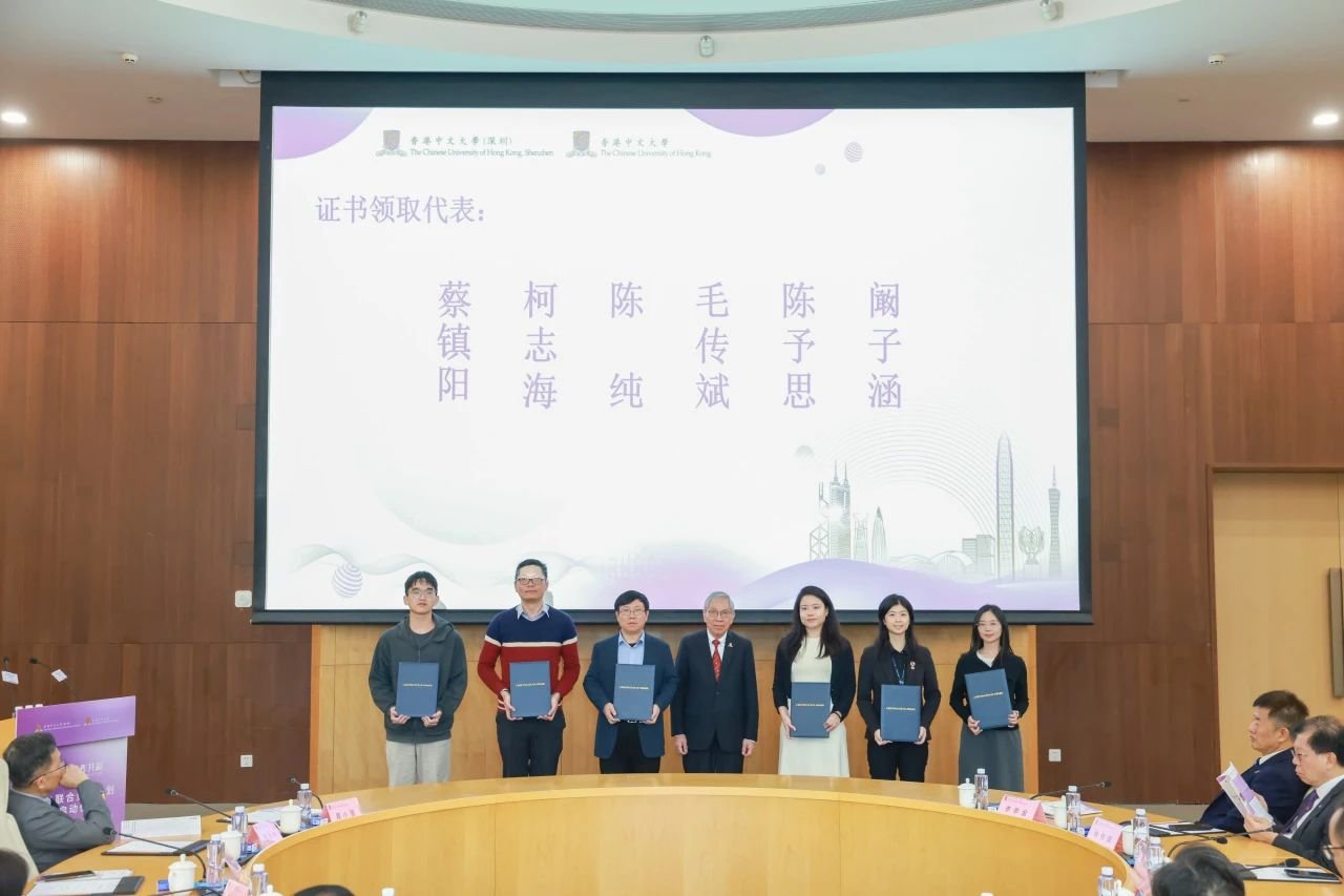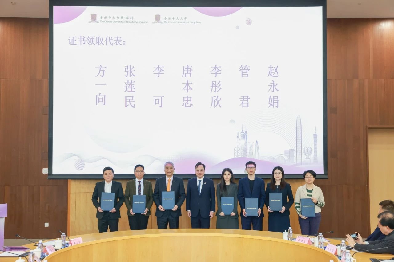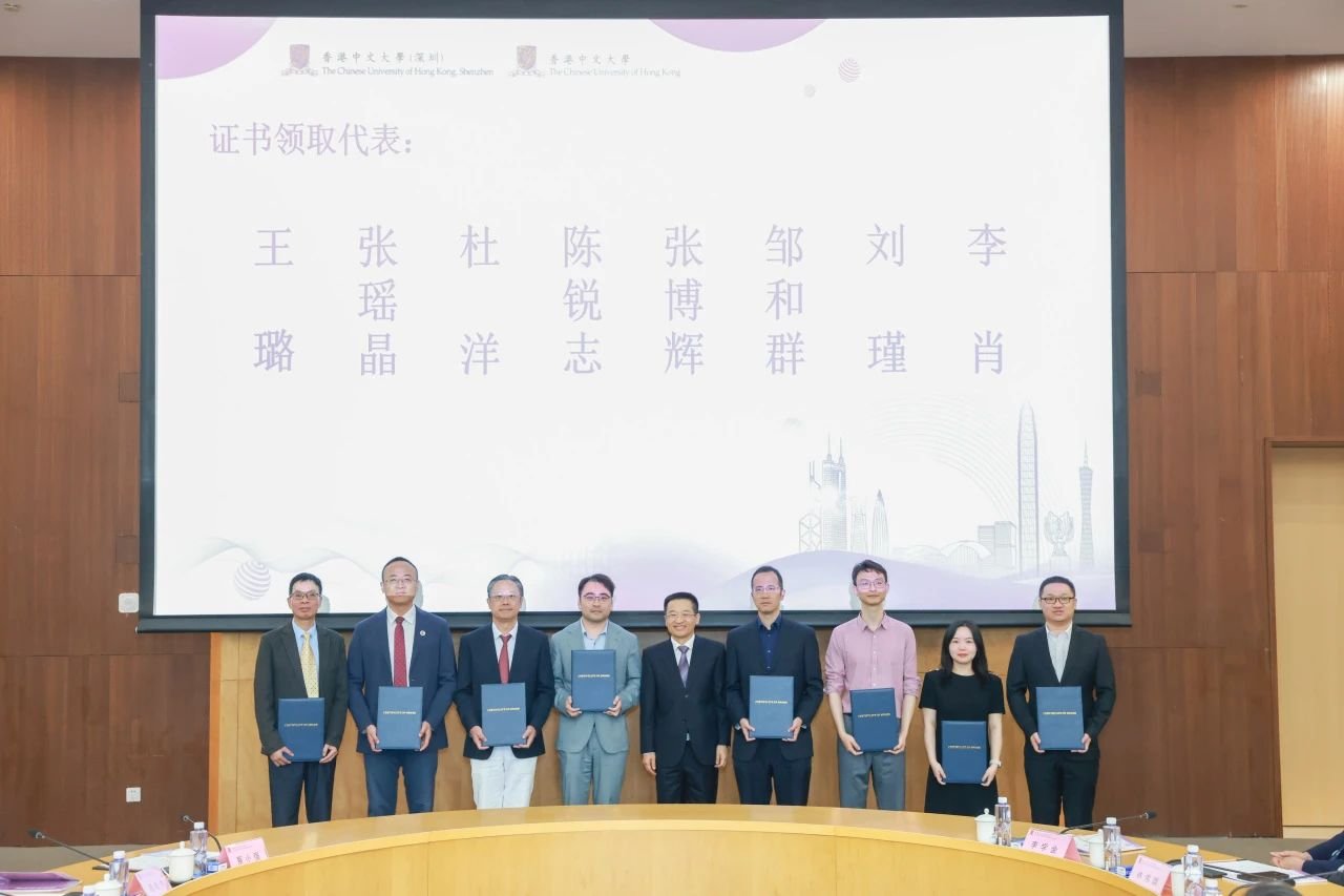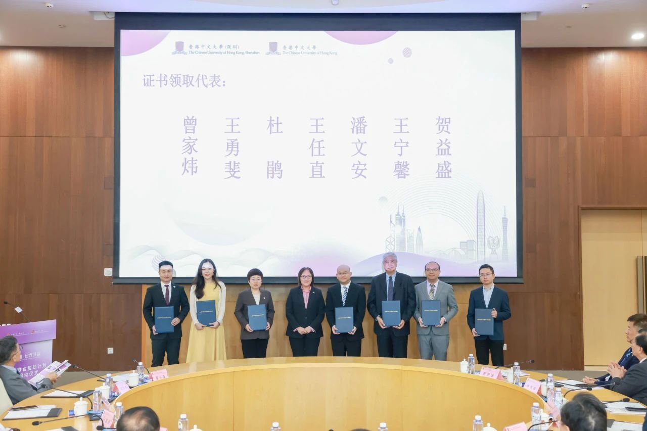 “1+1+1”計劃首批資助項目在與會嘉賓的共同見證下正式啟動,龔國平書記、盧煜明校長、徐揚生校長、港中大潘偉賢副校長、港中大(深圳)羅智泉副校長及港中大陳偉儀副校長分別為入選項目代表頒發(fā)了資助證書并合影留念。