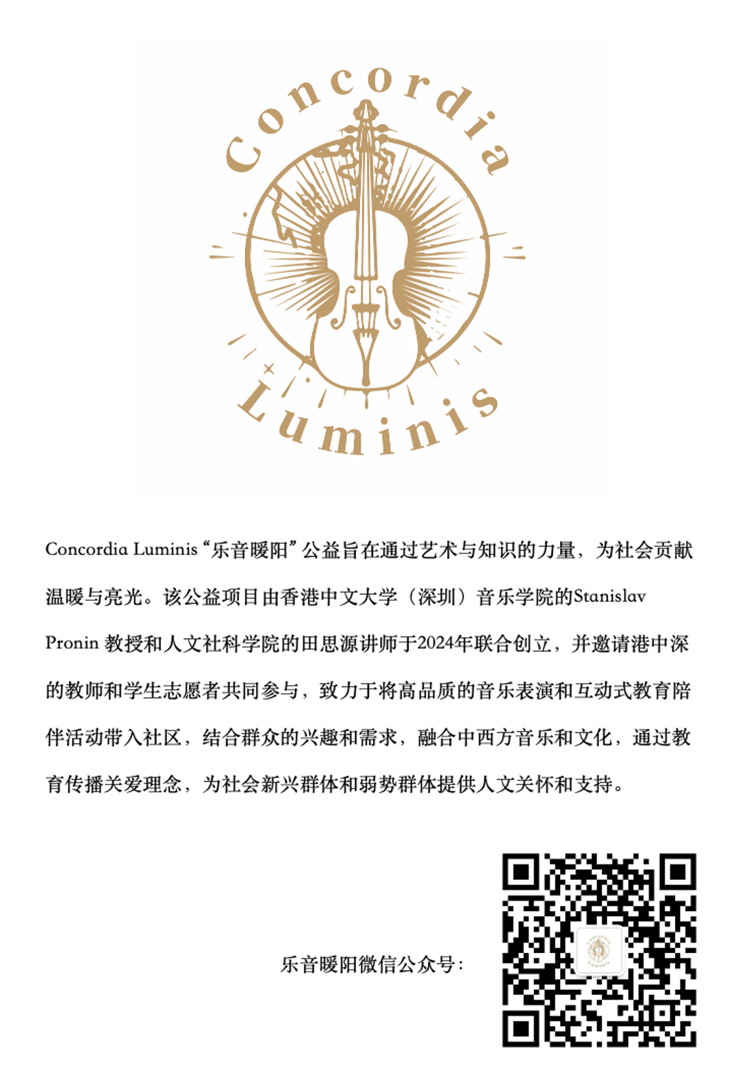 正如Pronin教授在D大調旋律共振中感受到的“人與藝術的共生”,這個項目的終極意義,或許正在于讓每個參與者都看見:藝術不僅在于舞臺上的璀璨的一瞬,更在于它能化作暖光,照亮那些原本不可觸及的角落。而當更多師生帶著“不必是詩人,但必須是公民”的信念加入,當音樂的實踐與公民的聲音持續對話。我們有理由相信,這場由港中大(深圳)師生發起的公益探索,終將如活動拉丁語名“Concordia Luminis”寓意的那樣,以和諧之音點亮更多生命的晴空。