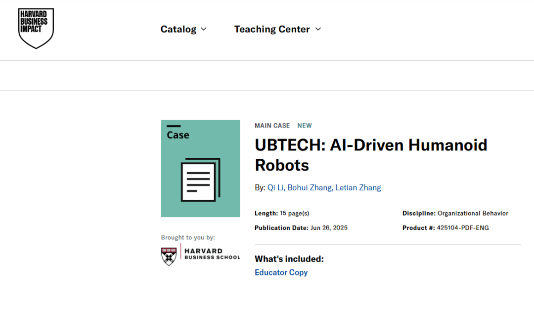 近日,李琦教授、張博輝教授與哈佛大學張樂天教授帶領香港中文大學(深圳)經管學院研究團隊撰寫的教學案例"UBTECH: AI-Driven Humanoid Robots" 成功被哈佛大學商學院案例庫(Harvard Business School Publishing)收錄,標志著經管學院在教學案例建設上取得了新的突破。
