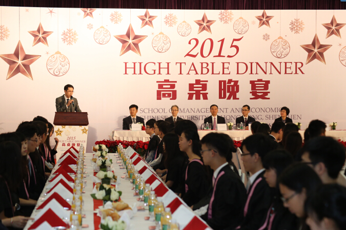 ? ? ? ?平安夜的鈴鐺叮叮咚咚地響了起來,圣誕樹上重重疊疊纏繞著的橙色小燈在黑夜里彌漫出溫暖的光輝。伴隨著鐘聲一記一記地敲響,2015年香港中文大學(深圳)經管學院高桌晚宴在12月23號圣誕前夕溫馨而甜蜜的氛圍里拉開了序幕。鋪著潔白桌布的長桌,背脊筆挺的高凳,空闊明亮的禮堂,身著學士袍的同學們邊享用著美食邊與教授嘉賓們親密地交談,人人沉浸其中,氣氛融洽典雅。