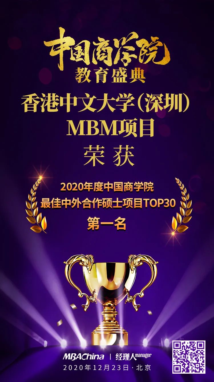 ? ? ? ? ?2020年12月23日,由MBAChina與《經(jīng)理人》雜志共同舉辦的“中國商學(xué)院”教育盛典在北京成功舉辦。本次盛典聚集了業(yè)內(nèi)知名專家、全國各大商學(xué)院院長、主任及杰出校友代表,并圍繞商科教育行業(yè)進(jìn)行了主題分享、圓桌對話、評選頒獎等一系列活動。同時在現(xiàn)場數(shù)百位嘉賓的共同見證下,2020年度中國商學(xué)院最佳中外合作碩士項(xiàng)目TOP30等多個獎項(xiàng)已全部揭曉。香港中文大學(xué)(深圳)管理學(xué)碩士項(xiàng)目(MBM)榮獲2020年度中國商學(xué)院最佳中外合作碩士項(xiàng)目TOP30榜單第一名。