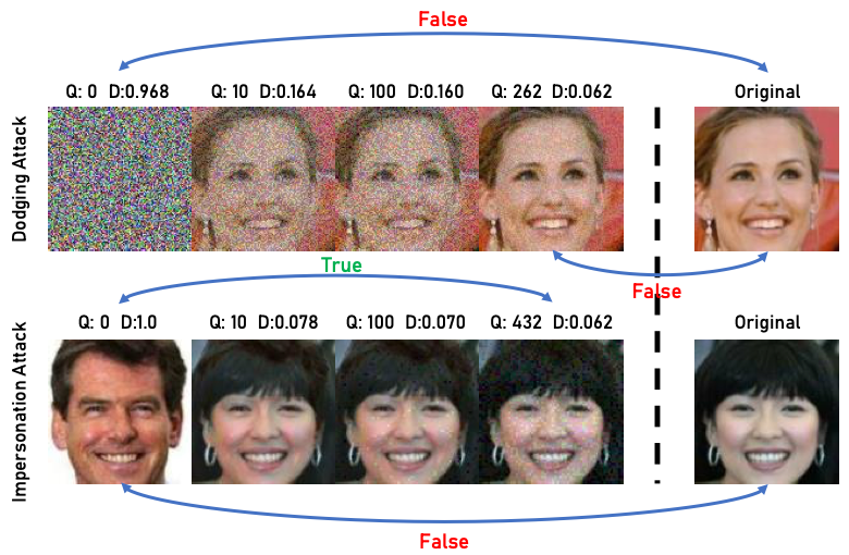圖1. 如上圖所示,僅需數百次查詢,本文提出的方法便可在基于決策的黑盒條件下成功攻擊實際人臉識別API。