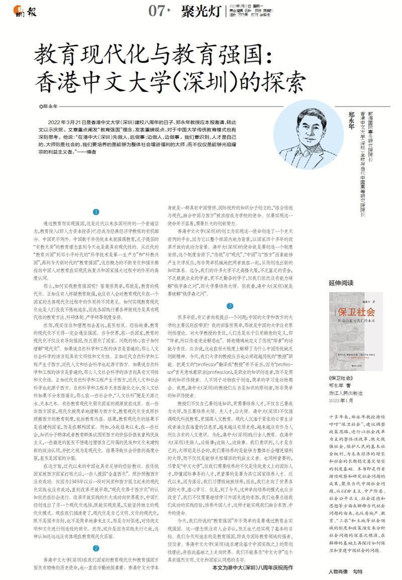 ? ? ? ?香港中文大學(xué)(深圳)校長講座教授、全球與當(dāng)代中國高等研究院院長鄭永年教授應(yīng)晶報(bào)邀請(qǐng),特別撰寫此文以示慶賀。文章重點(diǎn)闡發(fā)“教育強(qiáng)國”理念,發(fā)表重磅觀點(diǎn),對(duì)于中國大學(xué)傳統(tǒng)教育模式也有深刻思考。他說:“在港中大(深圳)先做人,后做事;邊做人,邊做事。我們意識(shí)到,人才是自己的,大師則是社會(huì)的,我們要培養(yǎng)的是能夠?yàn)檎w社會(huì)增進(jìn)福利的大師,而不僅僅是能夠光祖耀宗的利益主義者。”