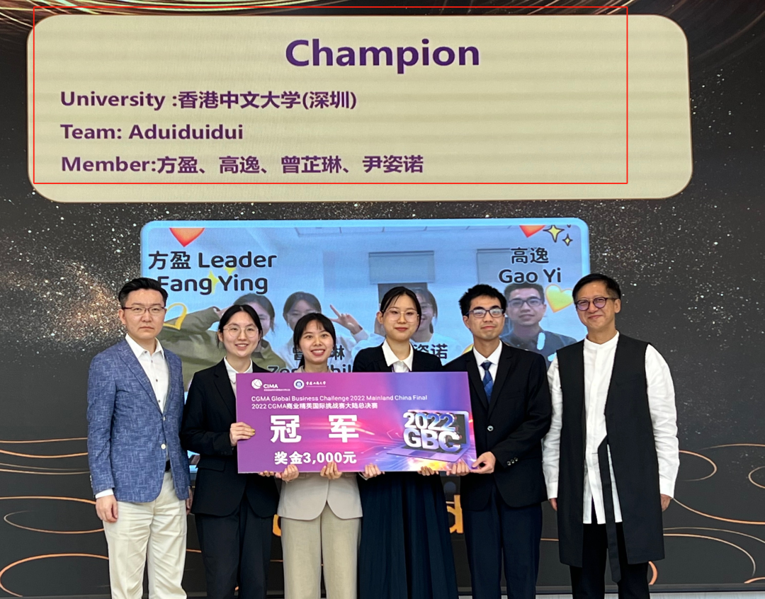 由香港中文大學(深圳)經(jīng)管學院本科生方盈、高逸、曾芷琳和尹姿諾組成的Aduiduidui學生代表隊繼奪得華南賽區(qū)冠軍再創(chuàng)佳績,喜提2022 CGMA商業(yè)精英國際挑戰(zhàn)賽全國賽冠軍和北亞極限賽季軍。方盈同學榮獲全國總決賽“最佳商業(yè)潛質(zhì)個人獎”。