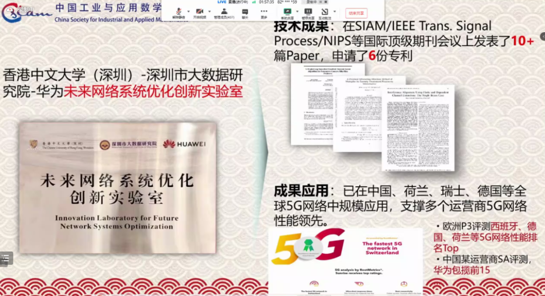 ? ? ? ?會上,香港中文大學(深圳)副校長(學術)、深圳市大數據研究院院長羅智泉院士因其在大規模無線網絡性能優化方面的杰出貢獻榮獲首屆王選應用數學獎。王選應用數學獎設立于2018年,今年是首屆頒獎,主要獎勵將數學研究成果落地應用并產生重大價值的杰出科學家。