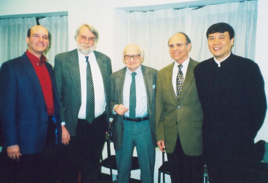 葉小鋼(右一)與美國伊斯曼音樂學(xué)院著名音樂家Samuel Adler(右二)、Christopher Rouse(左二)以及茱莉亞音樂學(xué)院著名作曲家Milton?Babbitt(中)合影