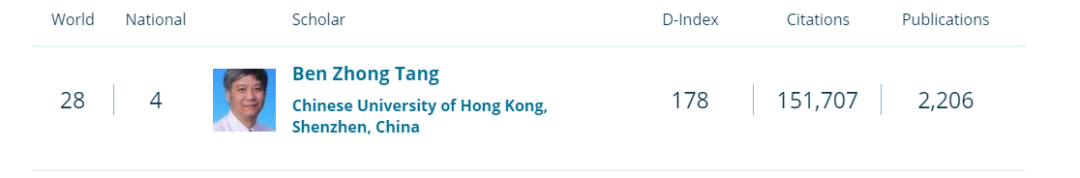 國際知名學術平臺Research.com發布了2023年度各個學科領域內的頂尖科學家榜單,香港中文大學(深圳)理工學院共有12位教授在各自領域內獲選為頂尖科學家。其中,唐本忠教授在化學領域被評為中國第一(世界第十五),在材料科學領域被評為中國第四(世界第二十八);張瑞教授在電子與電氣工程領域被評為新加坡第一(世界第四)。