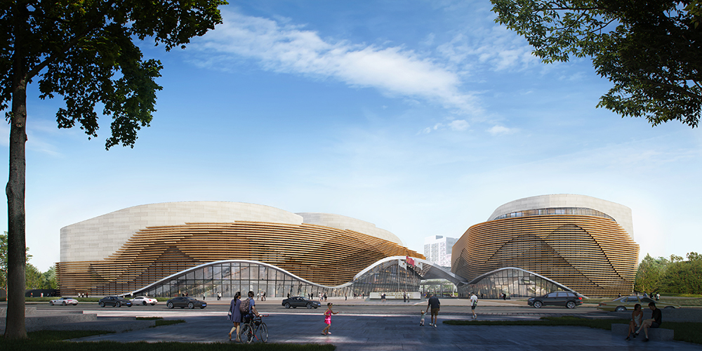 *教學(xué)大樓和學(xué)術(shù)交流中心以和而不同的對稱造型營造入口廣場空間以及城市主要形象,并以連橋框景軸線的起點;