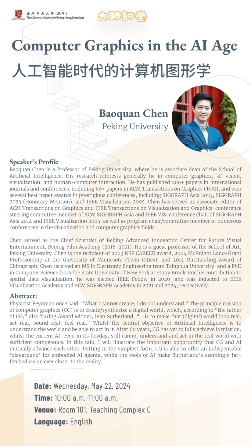 陳寶權,北京大學教授,智能學院副院長。陳寶權教授的研究領域涵蓋計算機圖形學、三維視覺、可視化以及人機交互。他已在國際期刊和會議上發(fā)表了200余篇學術論文,其中超過60篇發(fā)表于計算機圖形學領域的頂級期刊《ACM Transactions on Graphics》(TOG)。陳教授在多個享有盛譽的會議上獲得了最佳論文獎,包括2023年SIGGRAPH Asia、2023年SIGGRAPH(榮譽提名)和2005年IEEE Visualization。陳教授曾擔任《ACM Transactions on Graphics》和《IEEE Transactions on Visualization and Graphics》副編輯,ACM SIGGRAPH Asia和IEEE VIS會議指導委員會成員,SIGGRAPH Asia 2014和IEEE Visualization 2005的會議主席,以及可視化和計算機圖形學領域眾多會議的程序主席或委員會成員。