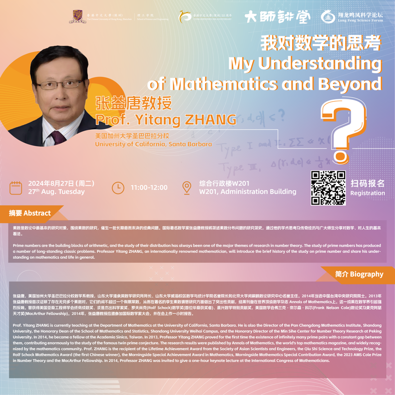 素數是數論中最基本的研究對象,圍繞素數的研究,催生一批長期懸而未決的經典問題。國際著名數學家張益唐教授將簡述素數分布問題的研究簡史,通過他的學術思考及傳奇經歷與廣大師生分享對數學、對人生的基本看法。