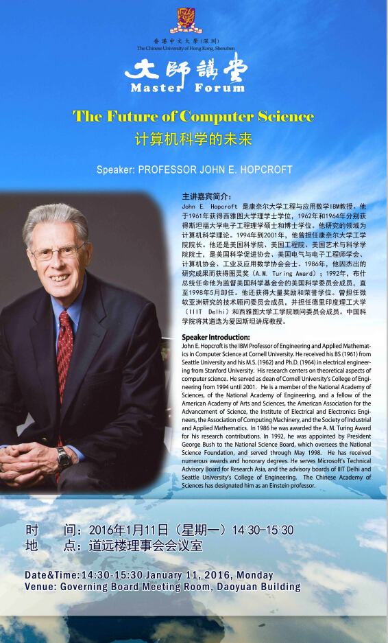 主講嘉賓簡(jiǎn)介:John E. Hopcroft 是康奈爾大學(xué)工程與應(yīng)用數(shù)學(xué)IBM教授。他于1961年獲得西雅圖大學(xué)理學(xué)士學(xué)位,1962年和1964年分別獲得斯坦福大學(xué)電子工程理學(xué)碩士和博士學(xué)位。他研究的領(lǐng)域?yàn)橛?jì)算機(jī)科學(xué)理論。1994年到2001年,他曾擔(dān)任康奈爾大學(xué)工學(xué)院院長(zhǎng)。他還是美國(guó)科學(xué)院、美國(guó)工程院、美國(guó)藝術(shù)與科學(xué)學(xué)院院士,是美國(guó)科學(xué)促進(jìn)協(xié)會(huì)、美國(guó)電氣與電子工程師學(xué)會(huì)、計(jì)算機(jī)協(xié)會(huì)、工業(yè)及應(yīng)用數(shù)學(xué)協(xié)會(huì)會(huì)士。1986年,他因杰出的研究成果而獲得圖靈獎(jiǎng)(A.M. Turing Award);1992年,布什總統(tǒng)任命他為監(jiān)督美國(guó)科學(xué)基金會(huì)的美國(guó)科學(xué)委員會(huì)成員,直至1998年5月卸任。他還獲得大量獎(jiǎng)勵(lì)和榮譽(yù)學(xué)位。曾擔(dān)任微軟亞洲研究的技術(shù)顧問(wèn)委員會(huì)成員,并擔(dān)任德里印度理工大學(xué)(IIIT Delhi)和西雅圖大學(xué)工學(xué)院顧問(wèn)委員會(huì)成員。中國(guó)科學(xué)院將其遴選為愛(ài)因斯坦講席教授。