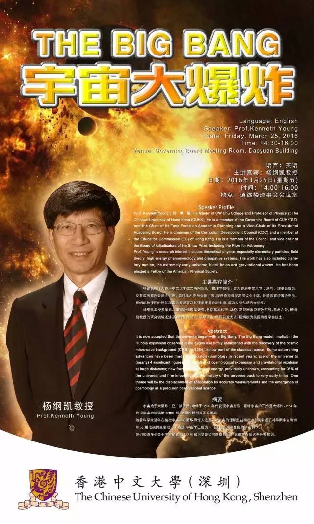 宇宙始于大爆炸,已廣被接受。哈勃于1930年代發現宇宙膨漲,意味宇宙的開始是大爆炸。1964年發現宇宙微波輻射(CMB)后,大爆炸模型更不容置疑。隨著科學家近年在精密宇宙學方面取得驚人進展,對宇宙的理解愈益精密,人類掌握了對早期宇宙確切知識。用準確的量度取代了猜想,宇宙學已成為一門建立于觀測數據的精密科學。我們知道多少關于宇宙的真相?這些知識又是如何獲得的呢? 此講將介紹這些經典知識。