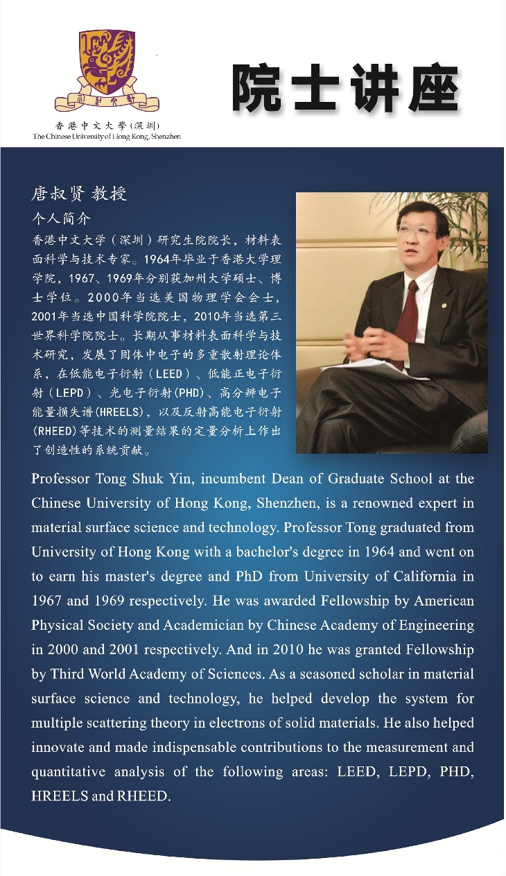 ????香港中文大學(xué)(深圳)校長(zhǎng)徐揚(yáng)生院士和研究生院院長(zhǎng)唐叔賢院士將于2016年8月29日在道遠(yuǎn)樓一樓理事會(huì)會(huì)議室開講。徐揚(yáng)生校長(zhǎng)是中國(guó)工程院院 士,國(guó)際宇航科學(xué)院院士,國(guó)際歐亞科學(xué)院院士,IEEE院士和香港工程科學(xué)院院士,長(zhǎng)期從事研究智能機(jī)器人研究,他將帶大家了解智能機(jī)器人的現(xiàn)實(shí)與夢(mèng)想。 研究生院院長(zhǎng)唐叔賢院士是材料表面科學(xué)與技術(shù)專家、中國(guó)科學(xué)院院士和第三世界科學(xué)院院士,他對(duì)高校教育也頗有見地,他將與港中大(深圳)的學(xué)生們分享如何 更好地向大師學(xué)習(xí)。