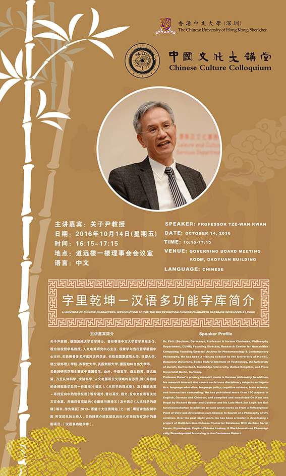 關教授研究范圍主要在于德國哲學,此外,于語言學、語文教育、語文政策,乃至認知科學、大腦科學、人文電算等交叉領域均有涉獵。除《海德格的詮釋現(xiàn)象學及同一性思維》(德文)、《從哲學的觀點看》、及《語默無常-尋找定向中的哲學反思》等專著外,曾以英文、德文、及中文發(fā)表有關論文百余篇,并編譯有克朗納《論康德與黑格爾》及卡西爾《人文科學的邏輯》等書。作為榮獲「2013-香港十大優(yōu)秀網(wǎng)站」之一的「粵語審音配詞字庫」開發(fā)團隊的主持人,關教授將介紹其團隊歷時八年而仍在開發(fā)中的最新項目:「漢語多功能字庫」。
