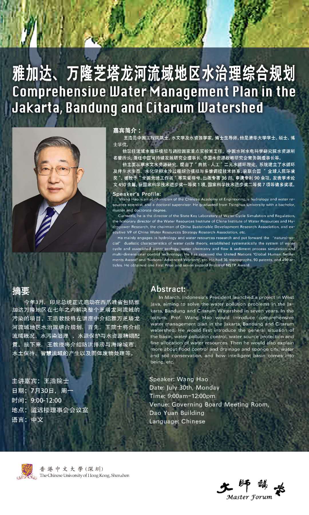 ? ? ? ? 今年3月,印尼總統正式啟動在西爪哇省包括雅加達萬隆地區在七年之內解決整個芝塔龍河流域的污染的項目。王浩教授將在講座中介紹雅萬芝塔龍河流域地區水治理綜合規劃,首先,王院士將介紹流域概況、水污染治理 、水源保護與水資源精細配置。接下來,王教授將介紹防洪排澇與海綿城市、水土保持、智慧流域的產生以及固體廢物處理等。