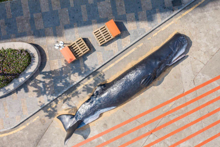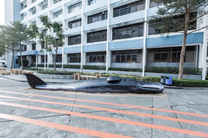 此外,白小刺也將對海洋的關愛注入了公共藝術作品中。白小刺作品《鯨鼓》,于2019深圳雙城雙年展鹽田分展場展出。《鯨鼓》由戶外公共雕塑和室內文獻兩部分組成。戶外公共雕塑作品于展館入口處,將海洋場景的鏡頭拉近,展示了深圳沿海鯨豚保育的迫切性。