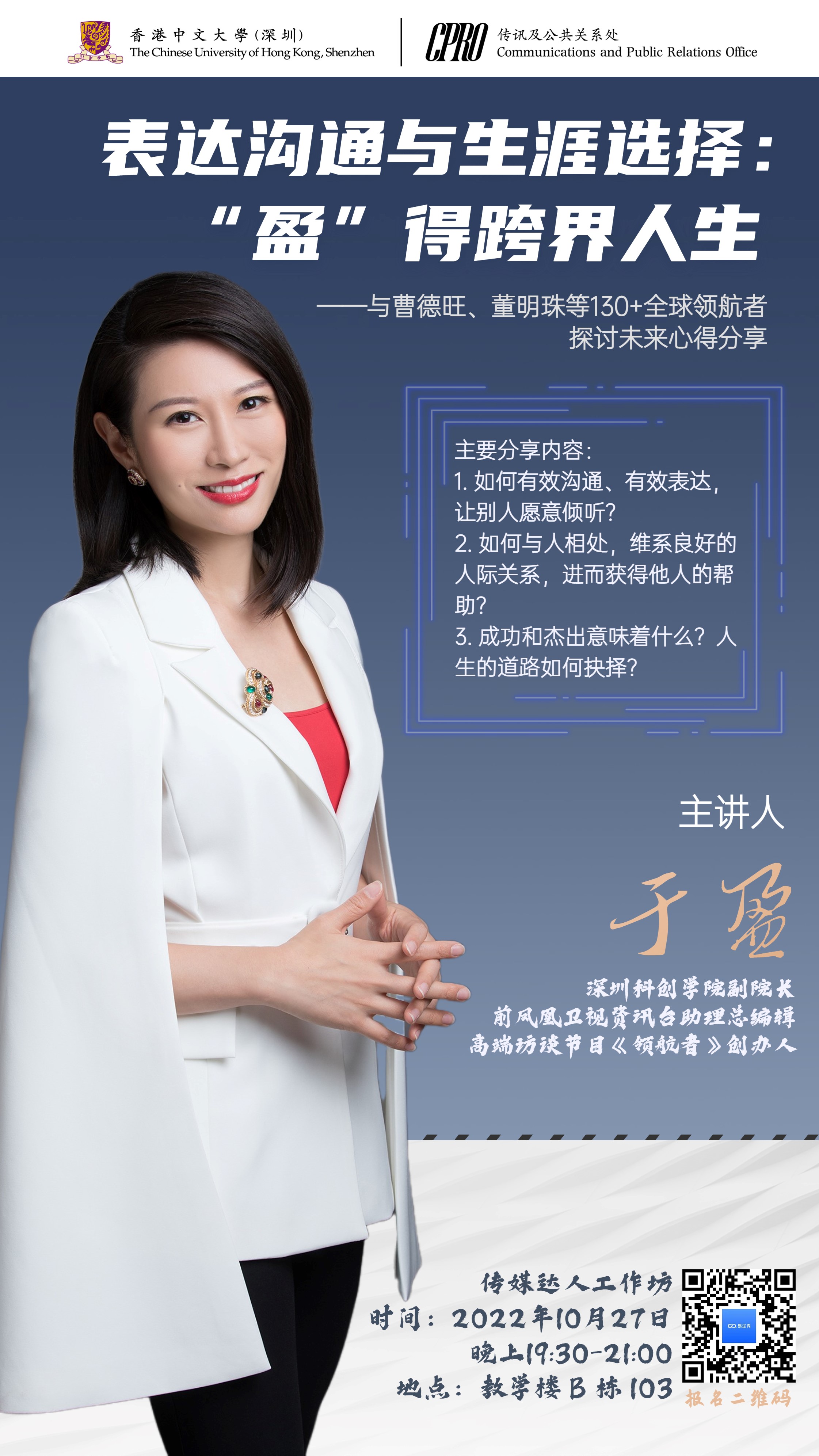于盈女士現任深圳科創學院副院長,她是前鳳凰衛視資訊臺助理總編輯,高端訪談節目《領航者》創辦人、制片人與主持人。她本科畢業于美國斯坦福大學經濟系,研究生畢業于哈佛大學肯尼迪學院公共政策系。
